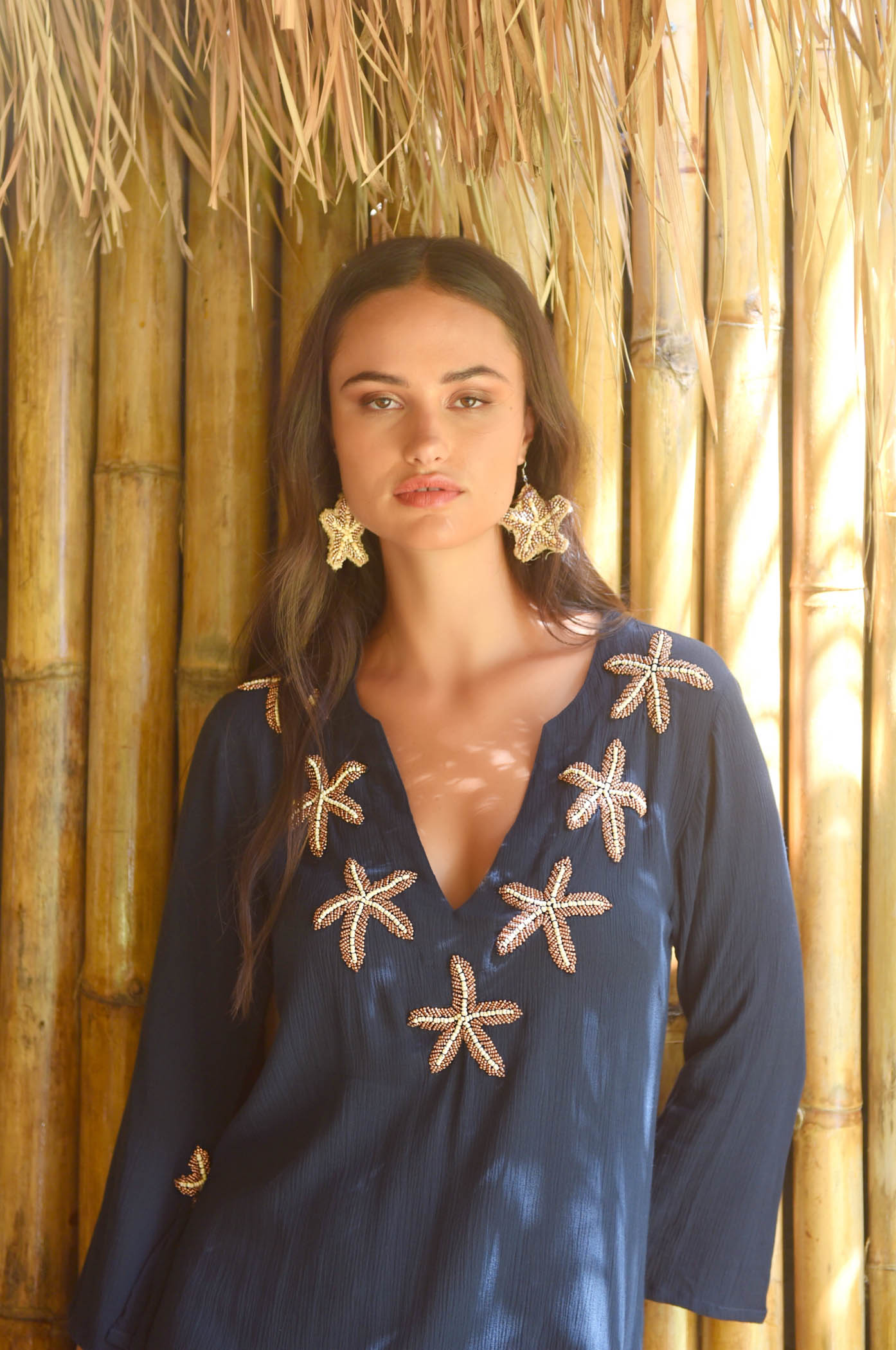 Tunic Starfish is one of Hot Lava’s iconic designs, a breathtaking piece that you can’t miss in your summer wardrobe. Adorned with handmade starfish shaped beading crafted with love in Bali. The fabric is a luxurious crinkle rayon voile, offering a lightweight and airy feel perfect for warm weather. Side slits add a touch of elegance and ease of movement, while an extra starfish beading on the back completes the look. Tunic Starfish is a true statement piece, embodying the essence of summer luxury. Available in many more lovable colour ways.